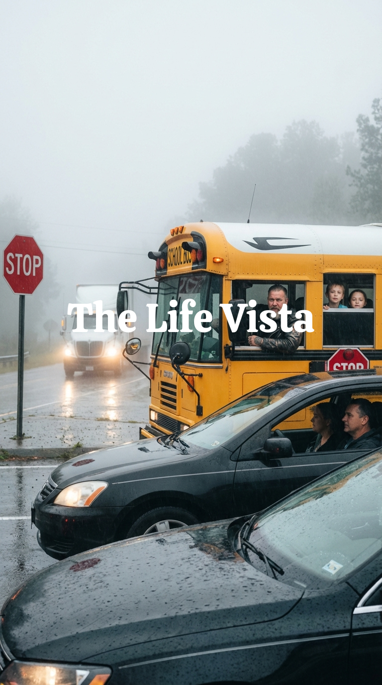 The following Tuesday arrived wrapped in a fog so thick it clung to the valley roads like wet cotton, turning familiar curves into gray tunnels where distance lost meaning, and most drivers moved too quickly out of frustration rather than caution, anxious to beat the clock rather than respect it. Sarah found herself behind the bus that morning, dropping her older daughter off at the middle school farther down the road, watching the yellow shape ahead move even slower than usual, its brake lights flaring gently, consistently, like a heartbeat.