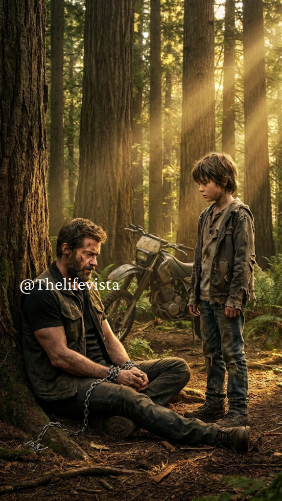 There, beside an old pine tree, was a sight that made his small heart pound. A man, huge, covered in tattoos, wearing a black leather vest with a red skull and wings that read, “Hell’s Angels,” was chained to the tree. His head hung low, his breathing heavy. A motorcycle stood nearby, dusty but gleaming in the setting sun.