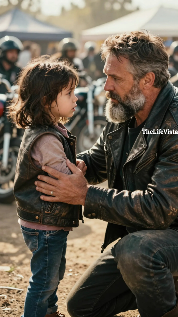 A voice cut through the music and the idle roar of engines. “President,” called a man from across the crowd, his tone clipped in a way that meant trouble, not chatter. Rook turned toward the speaker, a heavyset rider named Boone Mercer, no relation despite the shared last name, who was already pointing toward the edge of the performance area. Rook followed the line of his arm and immediately saw what Boone had seen. A little girl was weaving between parked motorcycles with the desperate, erratic speed of someone who wasn’t playing at all. She could not have been older than seven, and she moved with the blind urgency of prey.