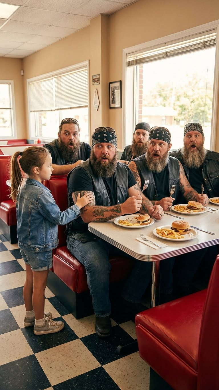 The diner fell into an uneasy hush the moment the little girl approached the biker gang. She stopped in front of them, lifted her hand, pointed to a single tattoo, and spoke five quiet words that changed everything: “My father had that same tattoo.”