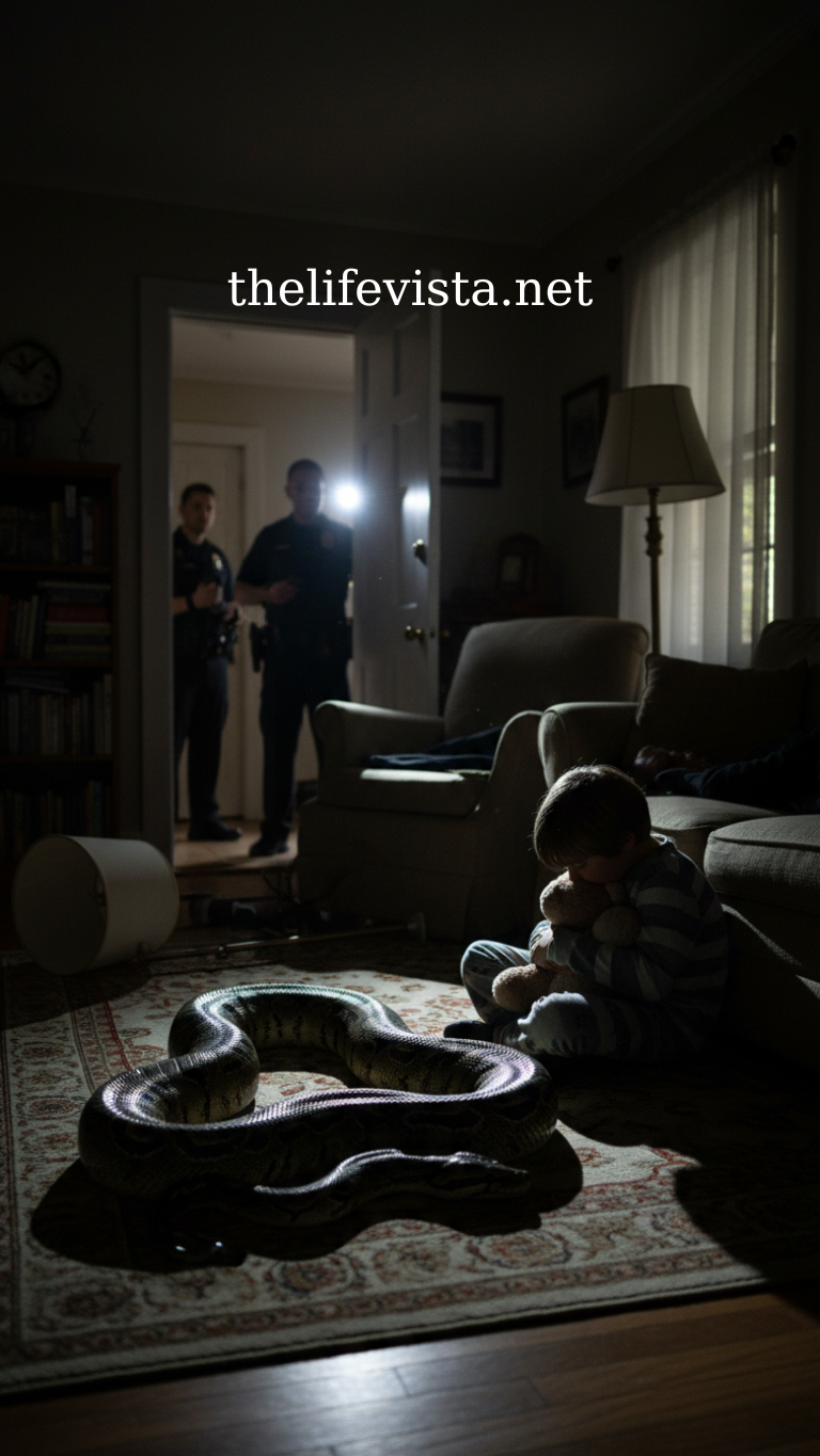 The snake moved slowly, a massive coil stretching across the carpet—slick with something dark. Brian Dawson lay slumped beside it, unmoving. Ava’s arm throbbed where she had been grabbed earlier. She didn’t know what to do. She didn’t know where her mother was. The house was too quiet.
