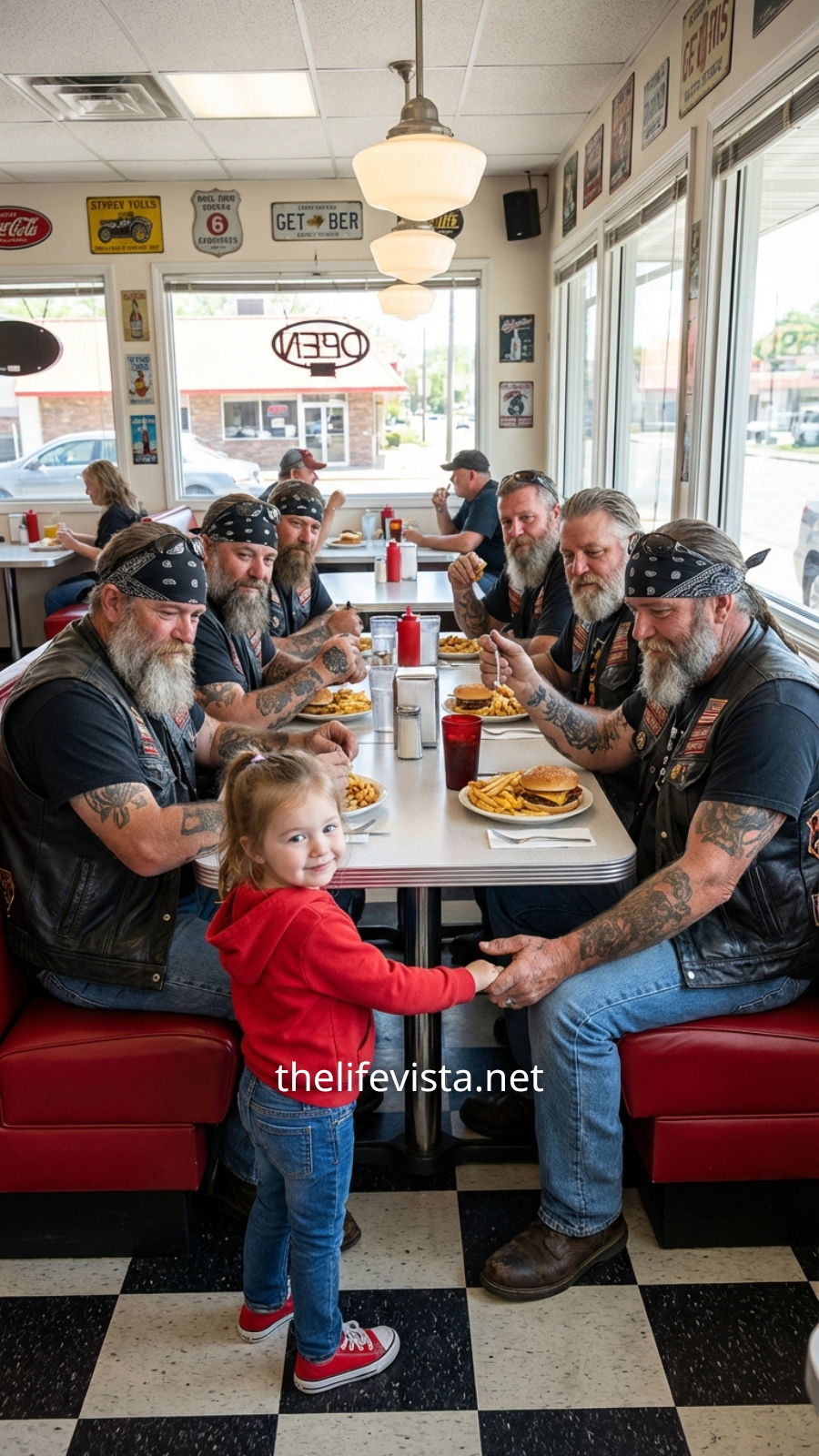 Five men occupied the corner booth they had claimed as their own for years. Their leather vests, worn smooth by years of wind and sun, seemed to bend the very air around them without effort. Not because they sought attention, but because experience had a way of settling into their very posture. They spoke easily among themselves, sharing quiet laughs—laughter not born from jokes but from shared history, a history that didn’t need explaining.