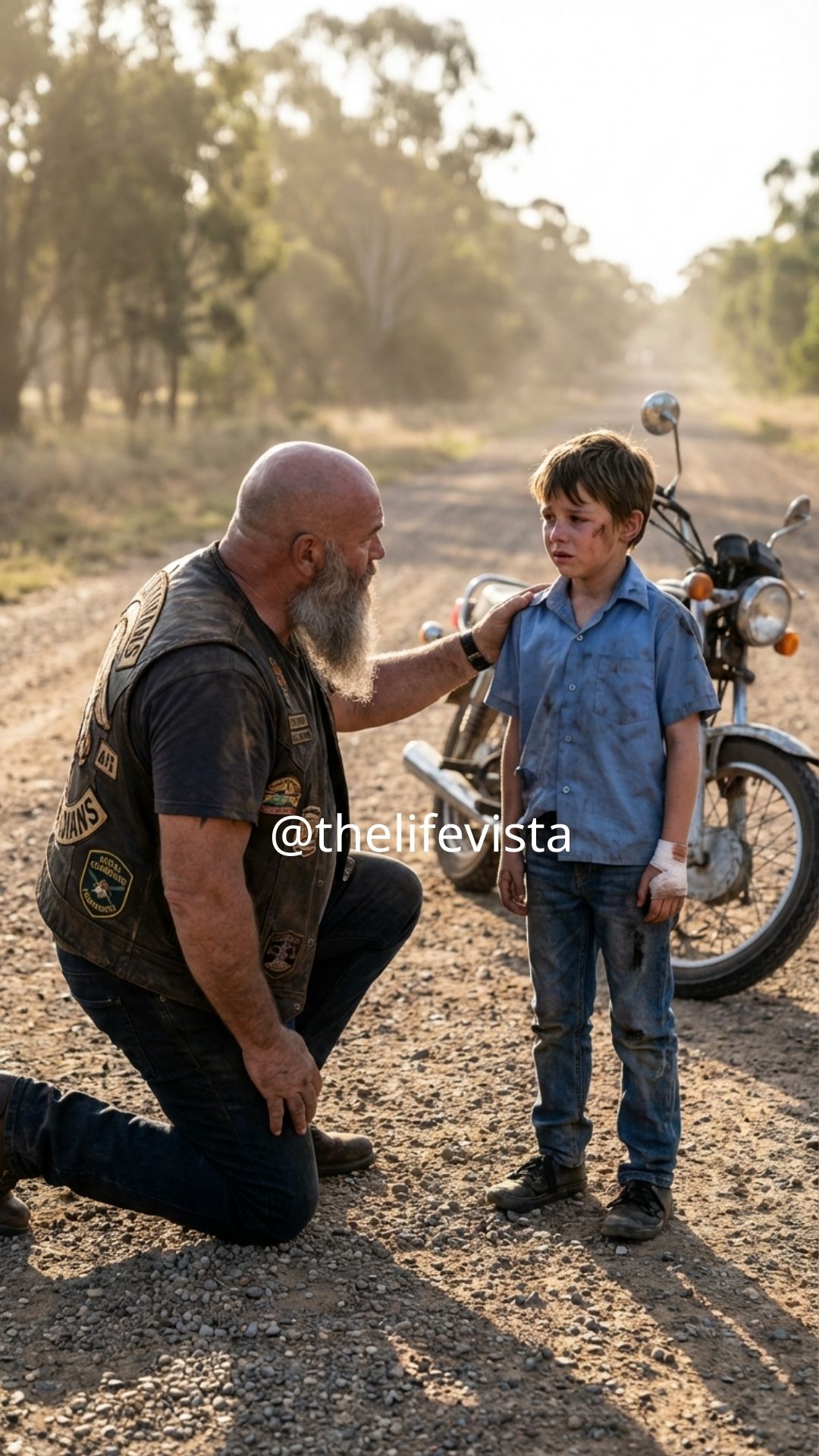 The boy flinched when he saw me, a big bald biker with a gray beard and a vest full of patches walking toward him, and he took a step back like he was going to run. “Hey, buddy. You okay?” I kept my voice soft. Non-threatening. “You’re a long way from anywhere.”
