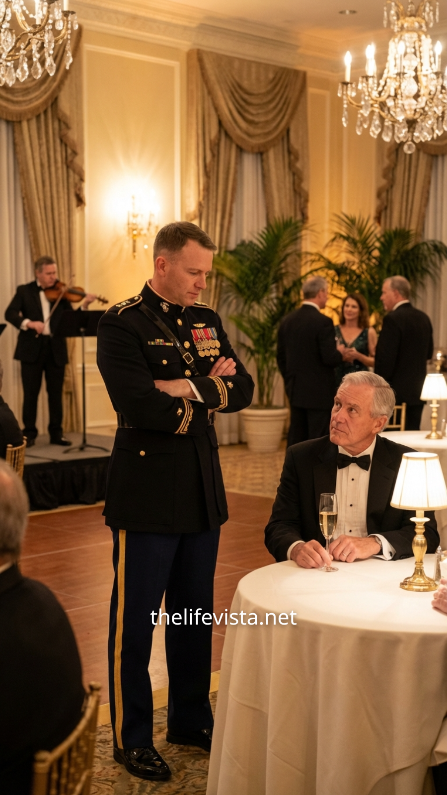 This quiet defiance from a frail-looking civilian was an irritant, a piece of grit in the otherwise flawless machinery of his evening. He leaned in closer, his voice a low growl. «Listen to me, old man. I am the senior officer hosting this event. I am giving you a polite opportunity to leave. Do not make me escalate this.» His eyes flicked down to the old man’s lapel.