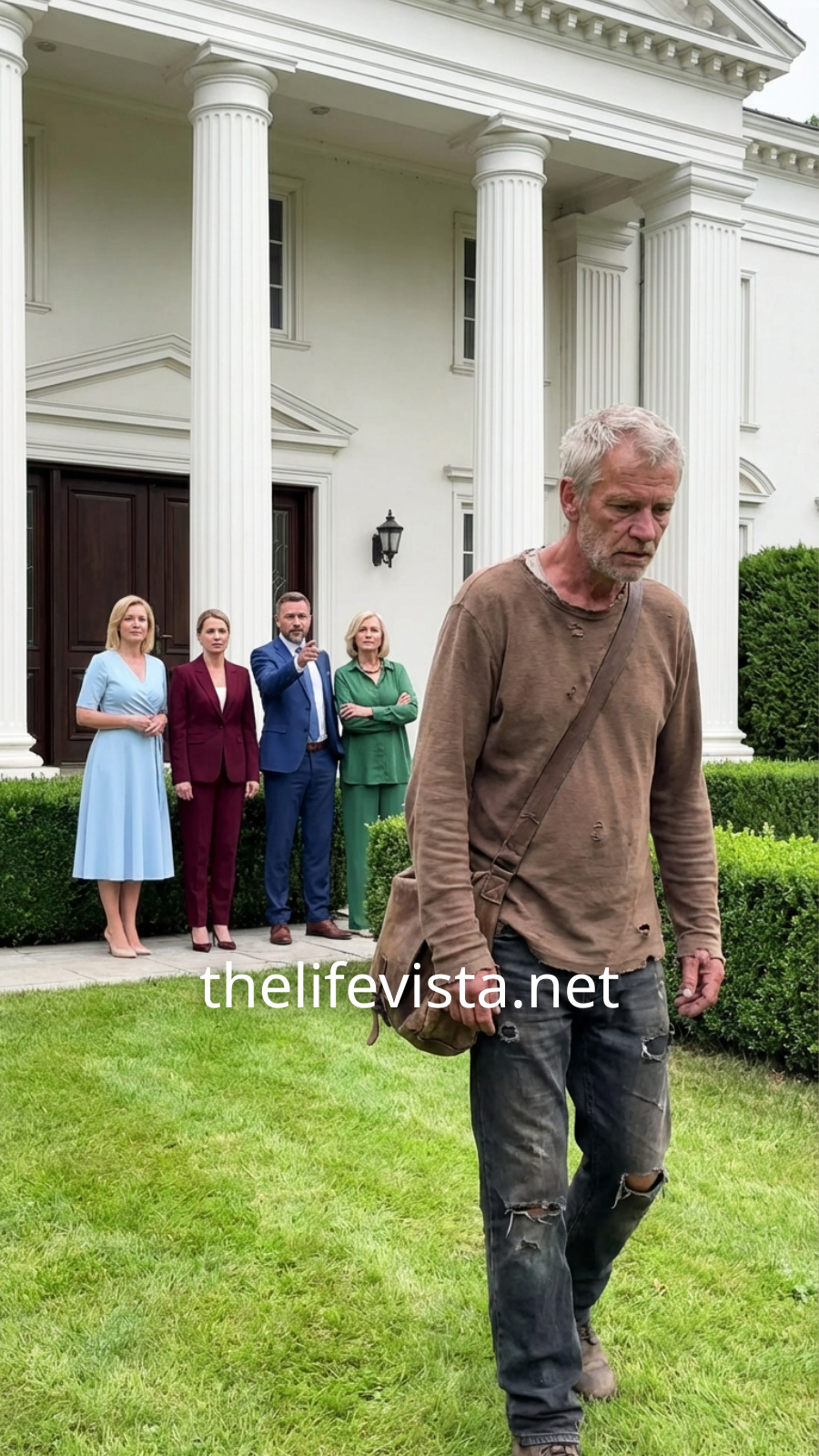 The men stood at the edge of the long driveway, staring at the house he had built from nothing. Marble steps, tall white columns, a front door that had welcomed success for decades. Today, he didn’t feel like the owner of any of it. He felt like a stranger. His clothes were torn and dusty. His hair was untrimmed.