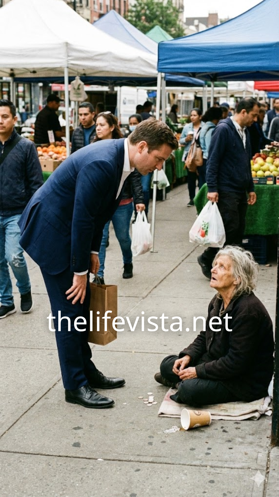 Near the corner of the market, a frail woman sat on the ground against a brick wall. A small piece of cardboard rested in front of her, marked with uneven letters: Hungry. Please help. Her coat was threadbare, her hair streaked with gray, and her hands shook as she extended a paper cup. Shoppers hurried past her—some dropping a coin without stopping, others pretending not to see her at all. Daniel’s jaw tightened as he approached. He disliked scenes like this, especially in public. To him, visible weakness was uncomfortable, almost offensive.