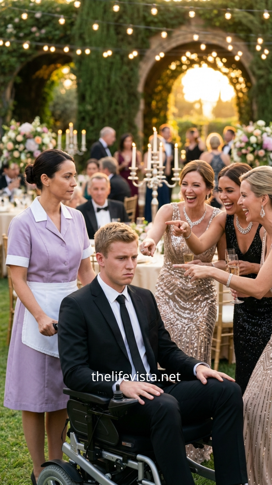 And then — behind him — Emily’s calm hand rested gently on the handle of his wheelchair. She said nothing, but her quiet presence stood between him and the humiliation.