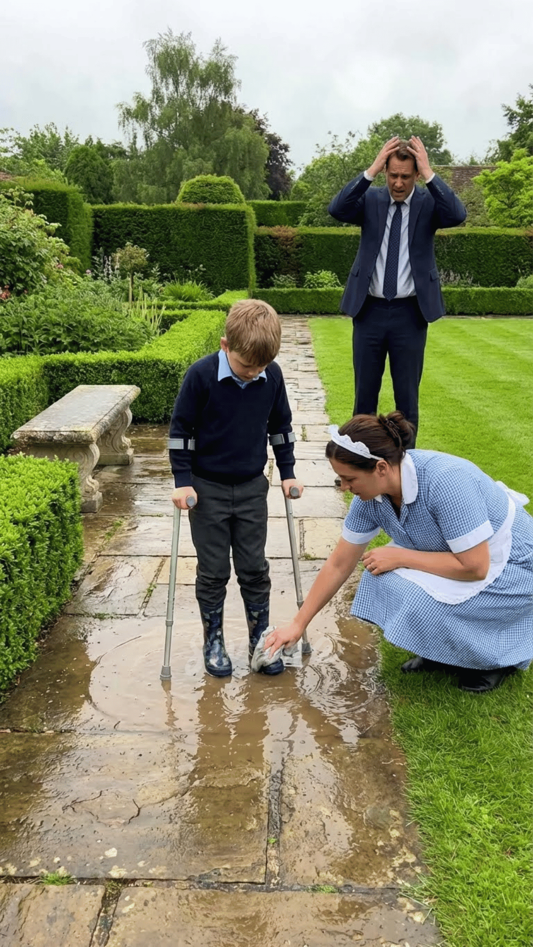 Alex Carter was used to getting home after 9 p.m., when everyone was already asleep. Today, however, the meeting with investors in New York had ended earlier than expected, and he decided to go straight home without telling anyone. As he opened the front door of his mansion in the suburbs, Alex stopped, unable to process what he was seeing. In the middle of the living room, Laura, the 28-year-old housekeeper, was kneeling on the wet floor with a rag in her hand. But that wasn’t what left him paralyzed. It was the scene beside her. His son, Charlie, just four years old, was standing with his small purple crutches, holding a kitchen rag and trying to help the young woman clean the floor.