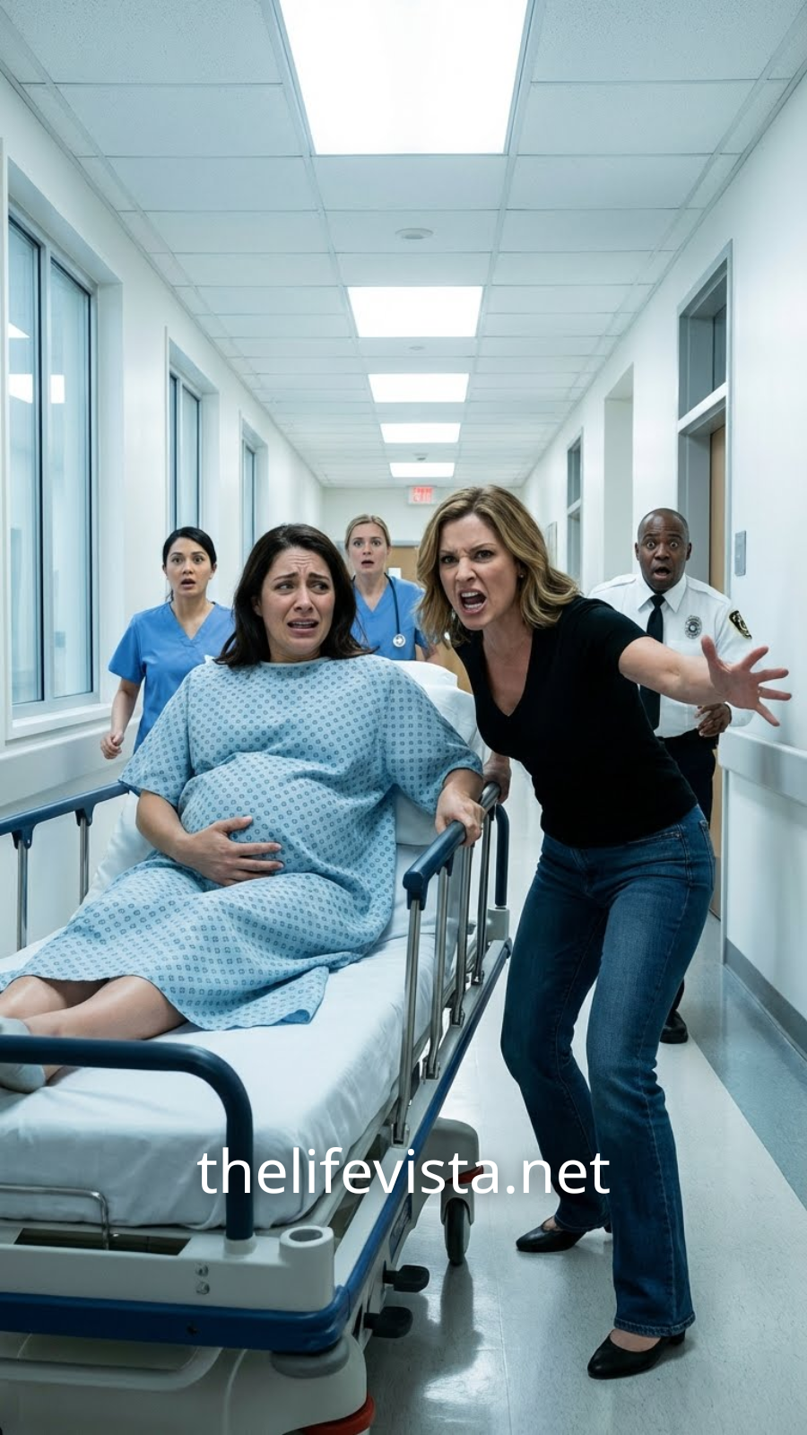 The sound of sobbing tore through the hospital hallway before anyone fully understood what was happening. The sharp, sterile smell of antiseptic blended with panic, thick and metallic. Nurses froze mid-step. A woman, heavily pregnant, her gown clinging to her shaking body, staggered backward clutching her belly. Another woman — draped in a royal blue designer dress — had her fist twisted in the pregnant woman’s hair, yanking with such force it echoed through the corridor.
