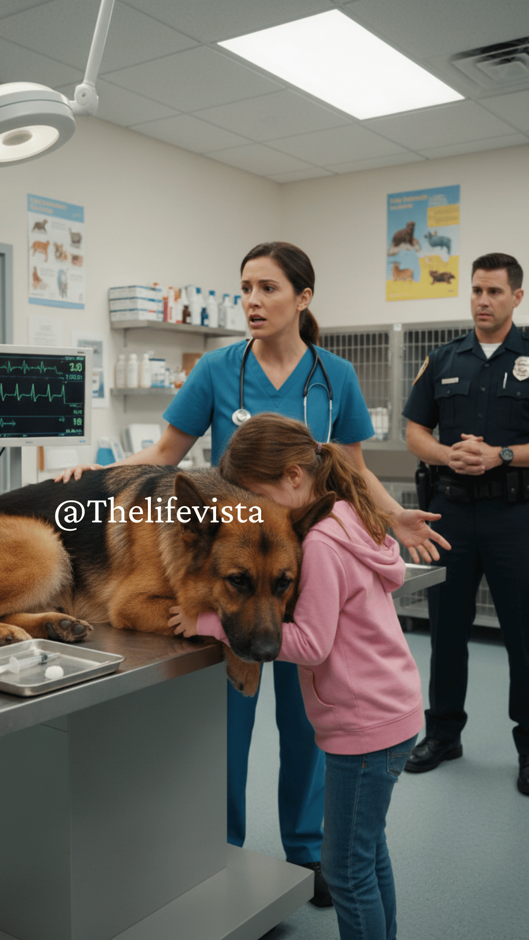 Everyone froze, and then something happened that no one expected. The dying dog lifted his paw slowly, fighting against his own failing body, and wrapped it around the girl in one final hug. Every heart in the room broke; even the toughest officers turned away, unable to watch the heartbreaking goodbye. In that moment, the vet took a step forward, staring at the animal with confusion, then sudden alarm. Something was wrong. His eyes widened, and his voice cracked.