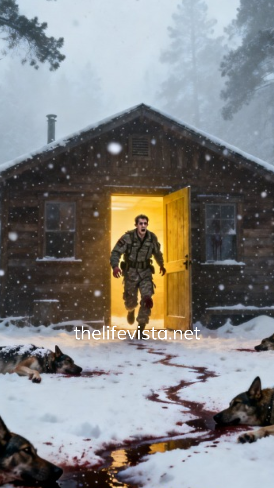 At his feet, scattered across the snow like discarded gear after a failed mission, lay German Shepherds. Large bodies unmoving. Blood staining the white. Frost stiffening their thick coats. Abandoned.