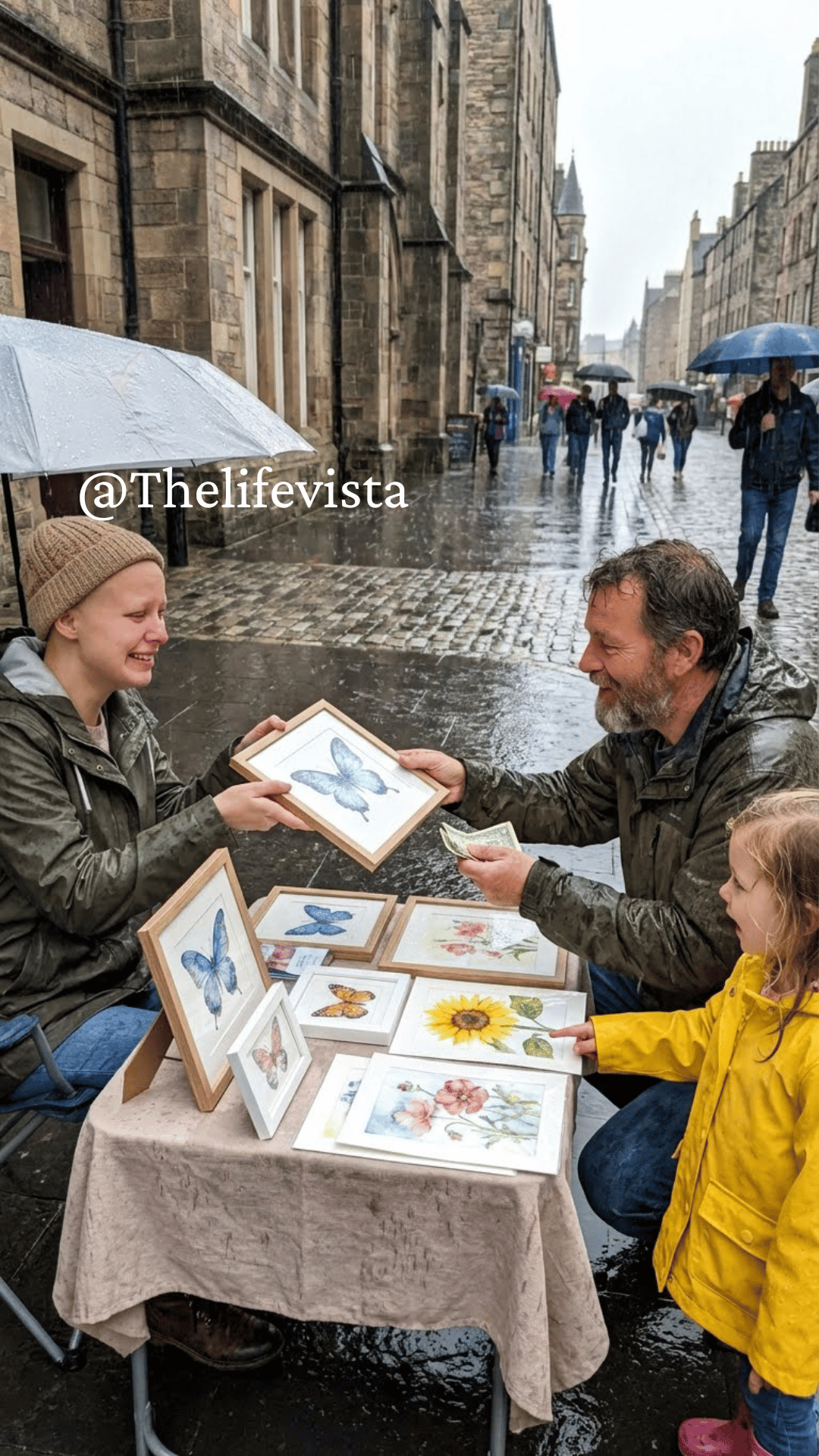 She set up a small table outside a coffee shop every weekend, her paintings spread across like colorful pieces of hope. Some days she made $10; other days, nothing. Yet she smiled at everyone who passed.