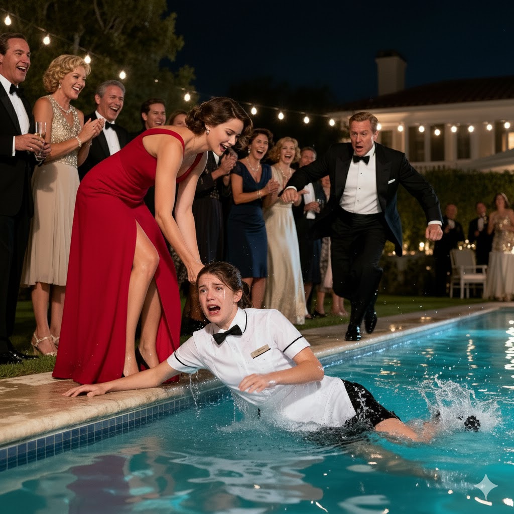 Before Grace could react, Chloe gave her a hard shove. The tray flew, glasses shattered, and Grace toppled backward—into the pool.