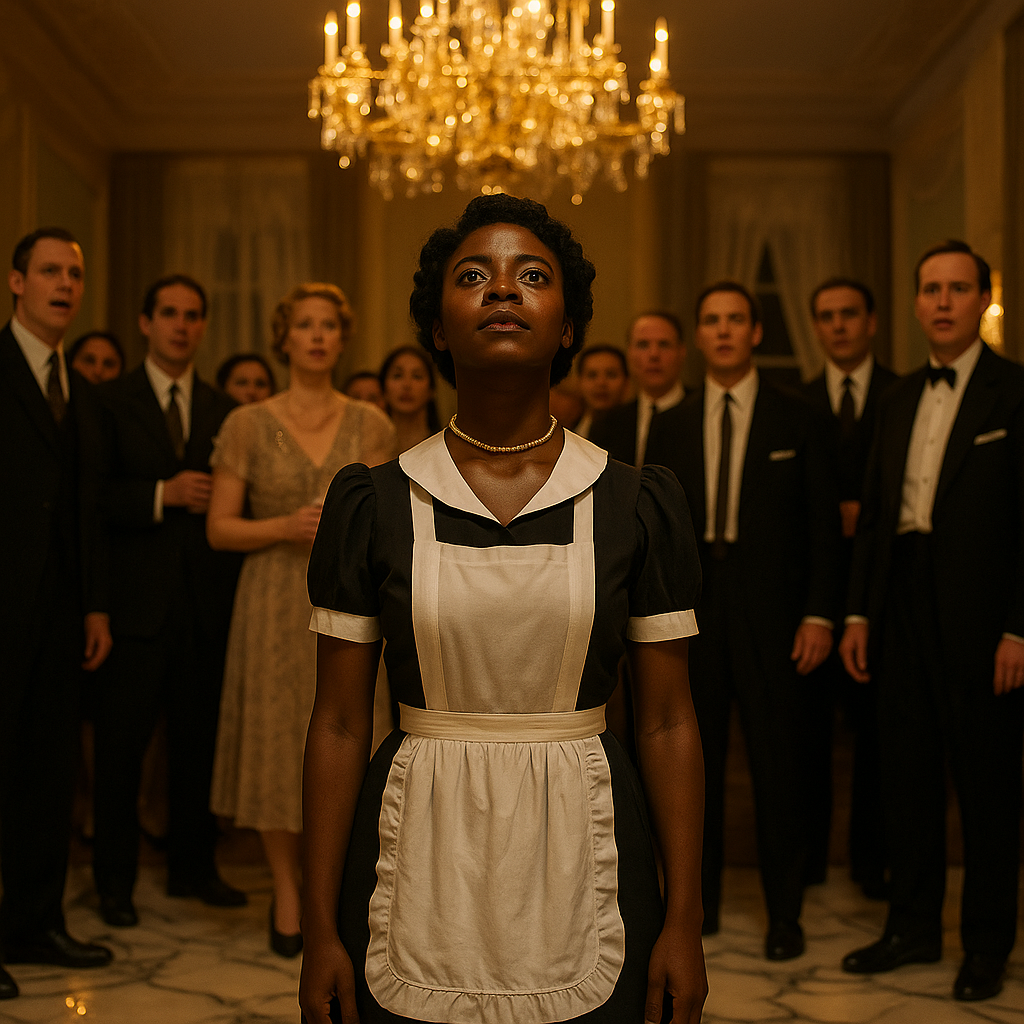 The room fell into a hush as Amara, a quiet Black maid in a simple uniform, was led in. Her eyes darted nervously from guest to guest. Jonathan leaned back in his chair, his voice dripping with arrogance.