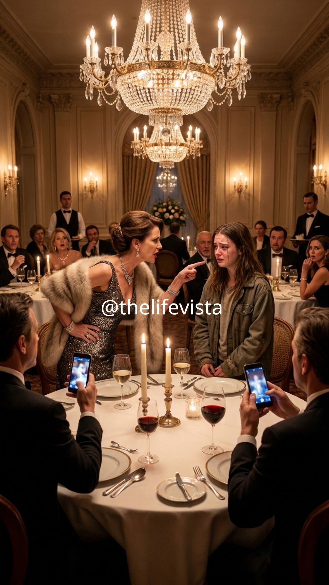 The fine-dining restaurant glowed with warm amber light, crystal chandeliers, and the soft clink of expensive wine glasses. Laughter floated between tables covered in white linen, and the air smelled of truffle oil and aged Bordeaux. At the center table, the glamorous rich woman, Victoria Langford, looked like she owned the entire room in her emerald silk gown and diamond earrings.