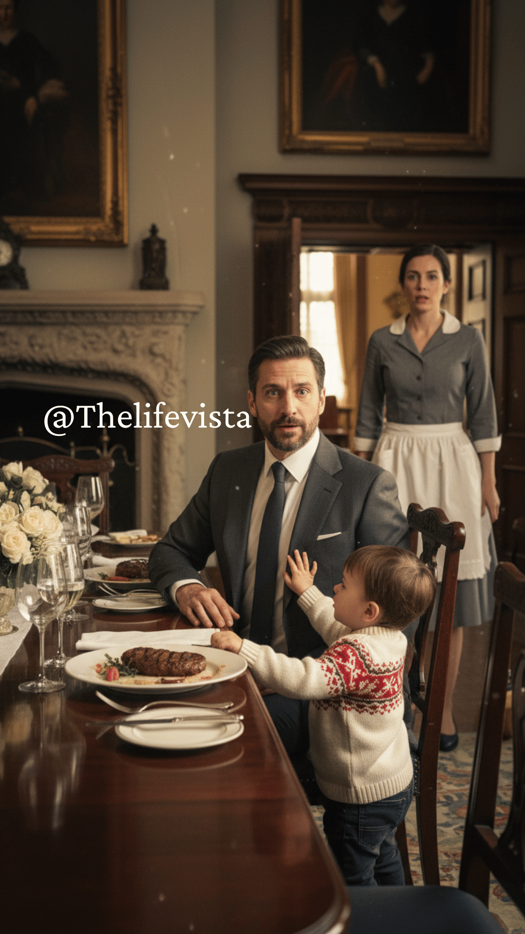 Meanwhile, Lucas wriggled out of the small playpen where Maria had placed him. Driven by curiosity, the toddler toddled down the hall toward the warm glow of the dining room lights. His tiny socks slid over the polished floors as he grabbed the wall for balance, drawn by the brightness and the smell of food.