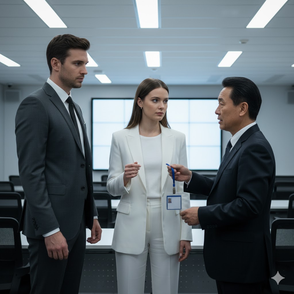 A man approached the desk—a tall, composed Chinese businessman in a perfectly tailored navy suit. His badge read “Mr. Lin Henry.”
