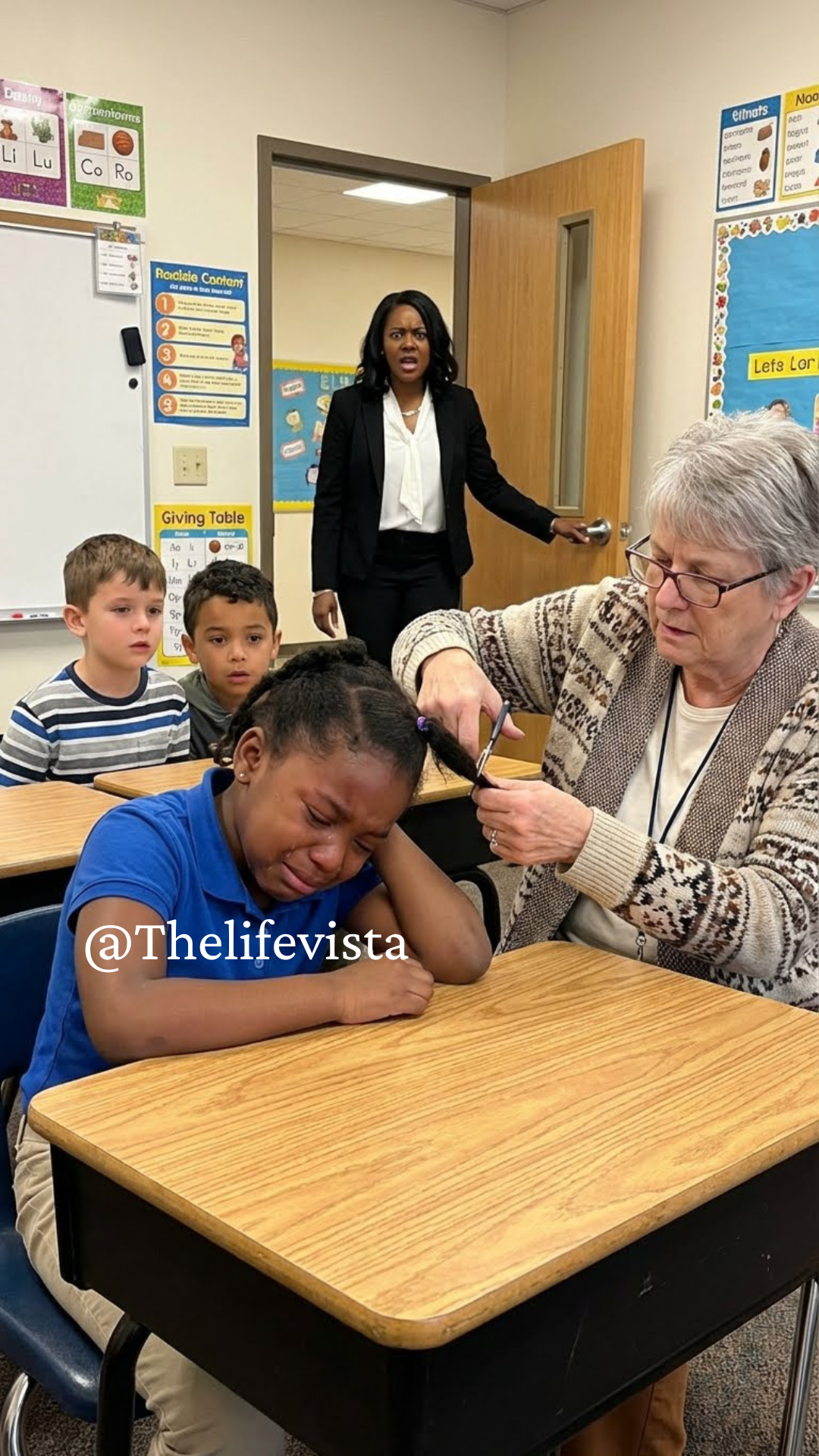 Mrs. Linda Davis, a veteran teacher known for her strictness, had accused Zaria of “being distracted by her looks” and claimed her hair “violated class decorum.” When Zaria tried to explain that her natural hair met the school’s grooming policy, Mrs. Davis snapped. She called her a “show-off,” dragged her to the supply room, and — in front of two terrified students — used a pair of scissors to hack off her puff.