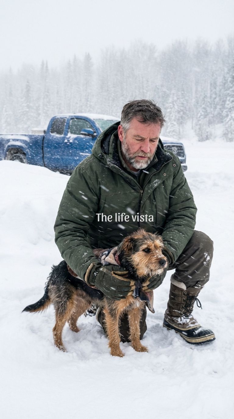 He trudged forward, boots sinking deep until he finally saw it clearly — a large shepherd mix dog, ribs visible beneath frozen fur, one paw twisted unnaturally, eyes barely open. The animal didn’t bark.