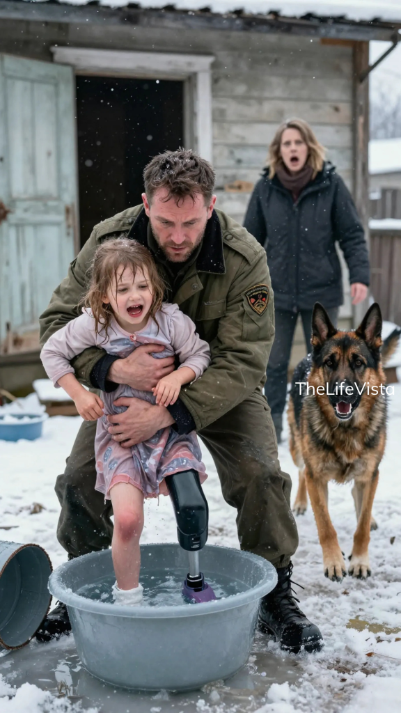 When his gaze settled on the scene before him, everything else fell away. His daughter stood in the cold, her small frame trembling violently as she struggled to remain upright in a basin of ice water. For a moment, he could not move, the image fixing itself in his mind with a clarity that left no room for doubt. Then instinct overtook everything else. He called her name with a force that broke the quiet of the yard, his voice carrying both urgency and disbelief.