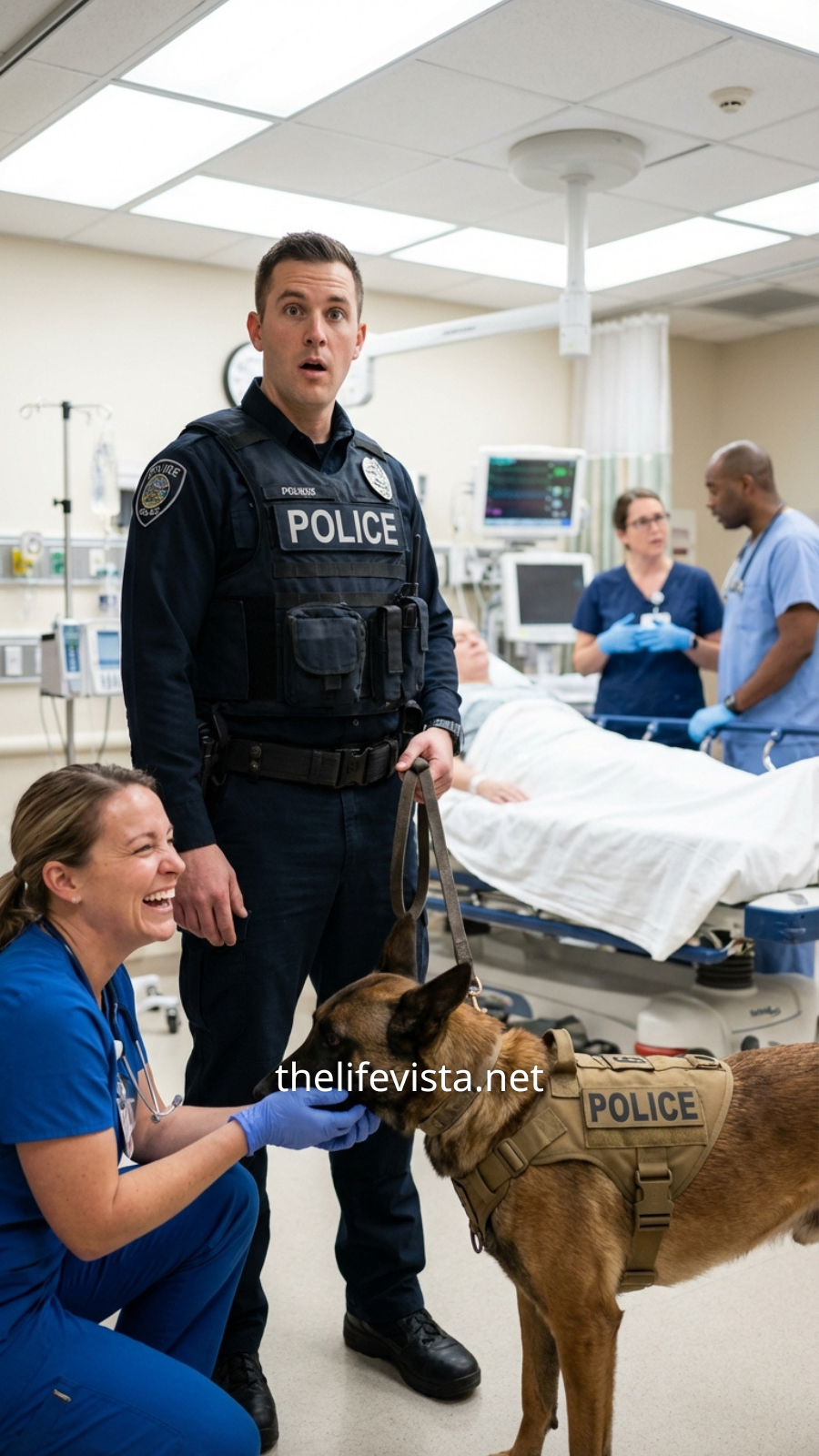 The incident began on what seemed like an ordinary weekday morning at St. Matthew’s Medical Center in northern Virginia. The emergency department moved with its usual controlled urgency—rolling carts rattled across polished floors, nurses exchanged clipped instructions, and the sterile scent of antiseptic lingered in the air. No one paid attention when a K9 bomb-detection unit entered through the ambulance bay for a routine sweep—no one except Lena Walsh, a quiet nursing intern restocking medications near the trauma elevators.
