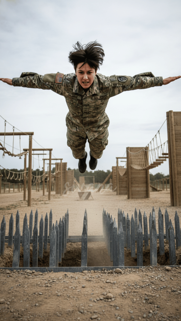 Instead of a long jump, she performed an explosive vertical bound, clearing the pit entirely and landing with a feather-like roll that absorbed all kinetic energy. Her boots didn’t even displace the pine needles that concealed the perimeter lip. The camera positioned at ground level captured the fluid, almost impossible movement. A dancer’s grace combined with a spider’s understanding of structural physics.