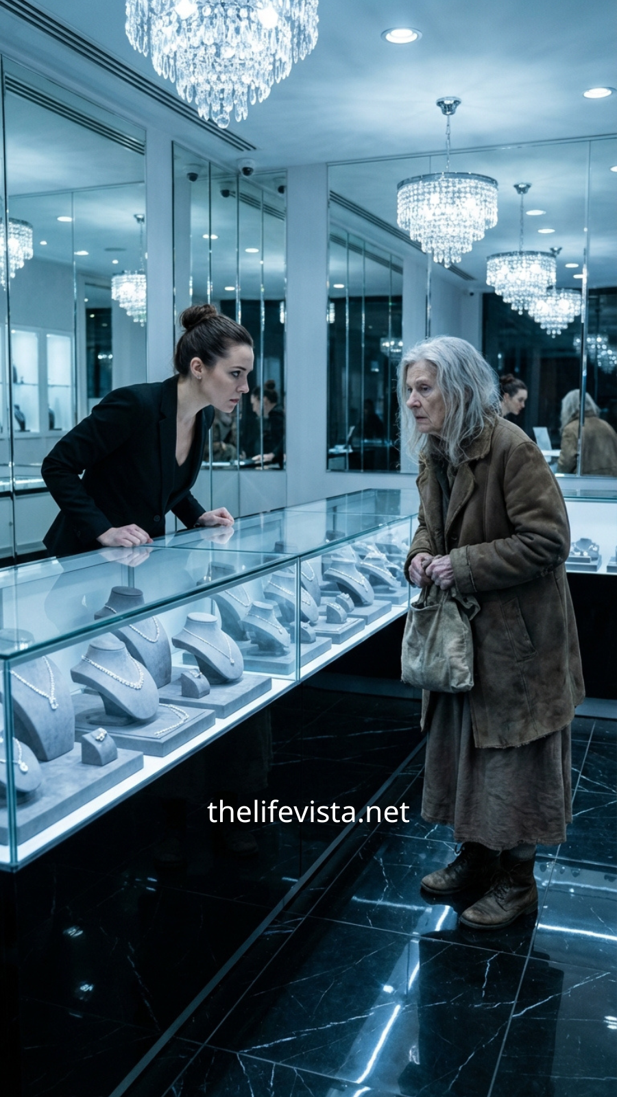 The woman who entered did not match the usual rhythm of evening appointments and anniversary shoppers. She was older—perhaps in her late seventies—with silver hair neatly pinned at the nape of her neck. She wore a charcoal wool coat, carefully mended at one sleeve, practical shoes, and a neatly folded blue scarf. Instead of a designer handbag, she carried a worn canvas tote. Nothing about her suggested carelessness. But nothing about her signaled wealth either. Still, there was something in the way she crossed the threshold—calm, unhurried, neither impressed nor intimidated—that hinted at a quiet confidence Avery should have recognized, but didn’t, because it lacked the familiar markers she had trained herself to trust.