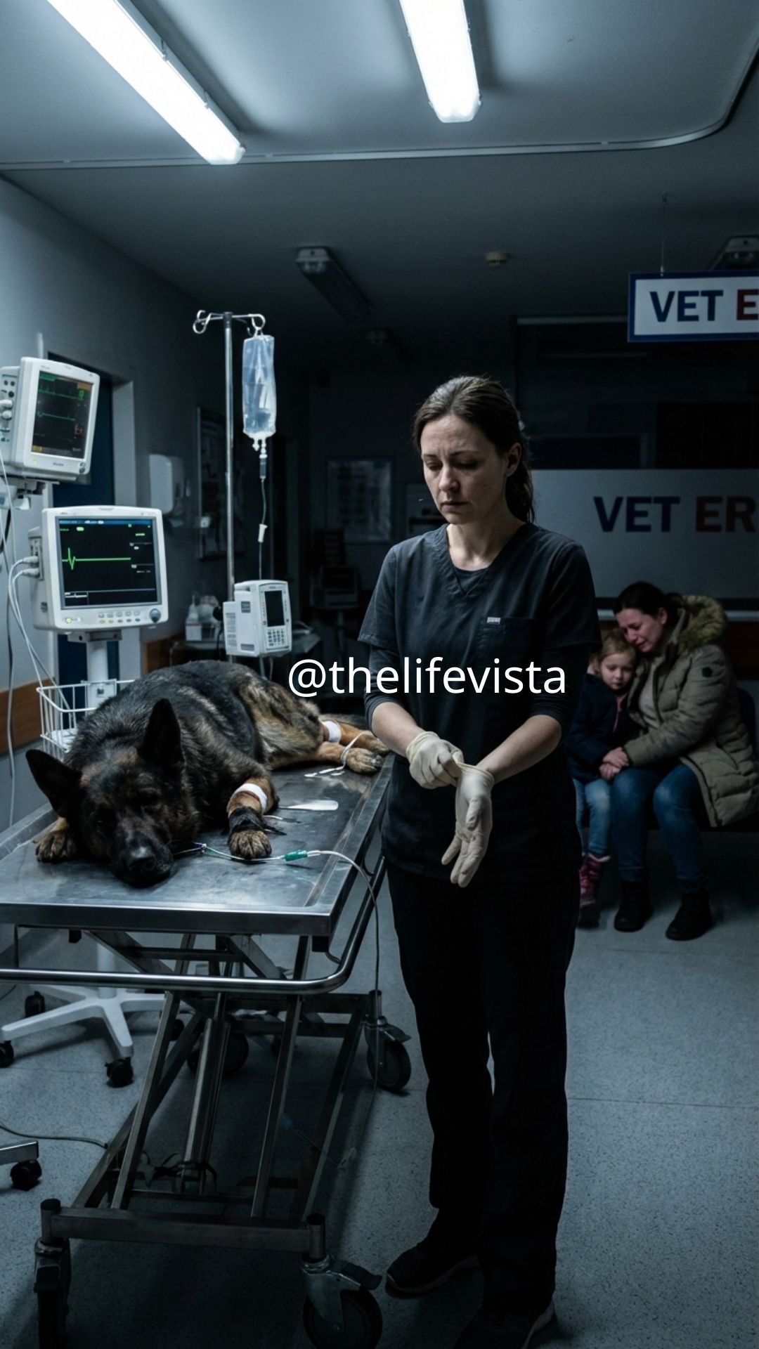 Near the wall, a woman in a smoke-stained coat covered her mouth and sank to the floor, her body folding in on itself as if grief were something with actual weight. Her son, maybe ten years old, clutched her sleeve with both hands and kept whispering, “Titan… Titan… please wake up,” while a nurse looked away and wiped her face. Another adjusted the sheet over the dog’s hind legs as if dignity still mattered, even now, because in rooms like that people cling to small acts of care when larger ones have failed.