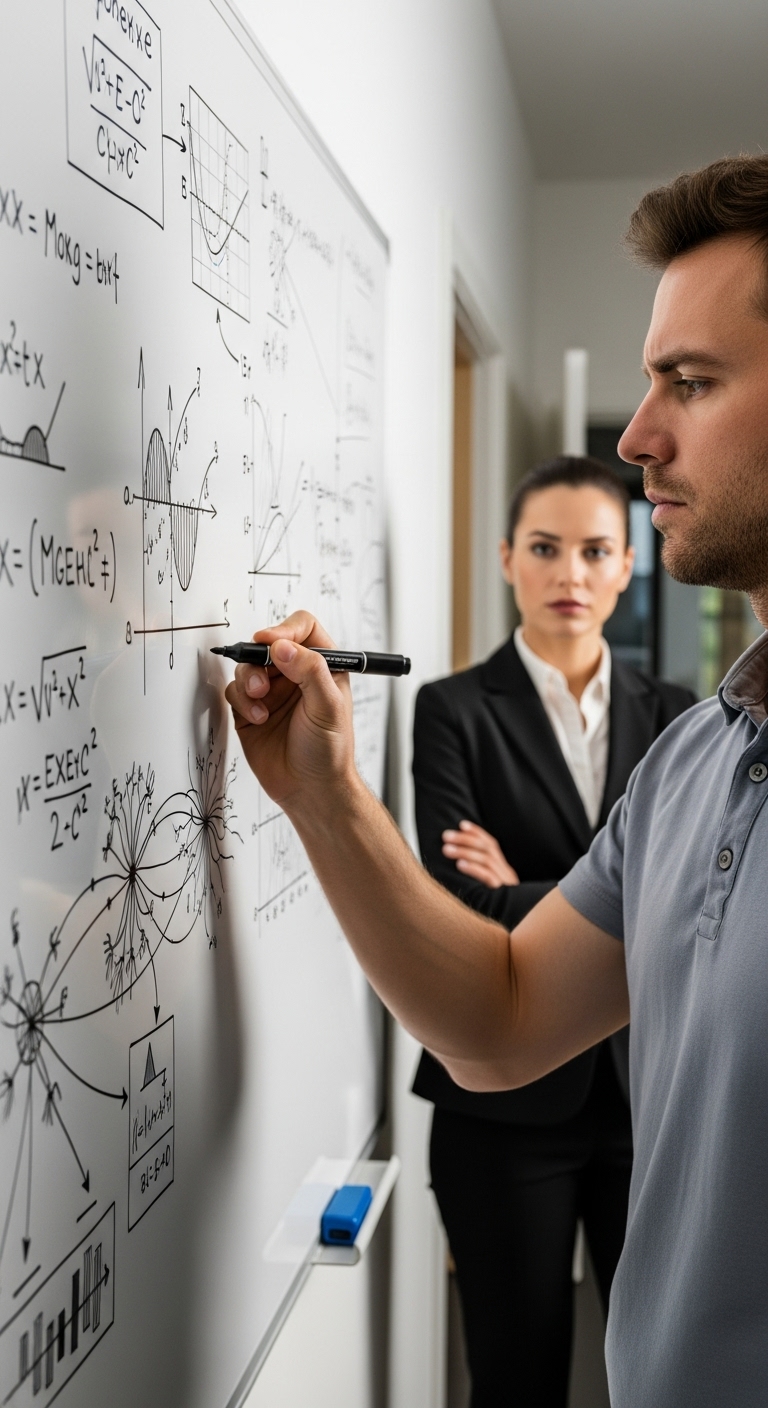 He stepped to the board. For a long minute he just looked, head tilted, fingers fidgeting with the cap of a marker he had taken from the supply closet. He could hear the blood in his ears and the hum of machines. The equations were right in structure but askew in balance — someone had double-weighted a node, skewed the sigmoid activation to compensate for noisy training. The model’s feedback loop had been choking itself.