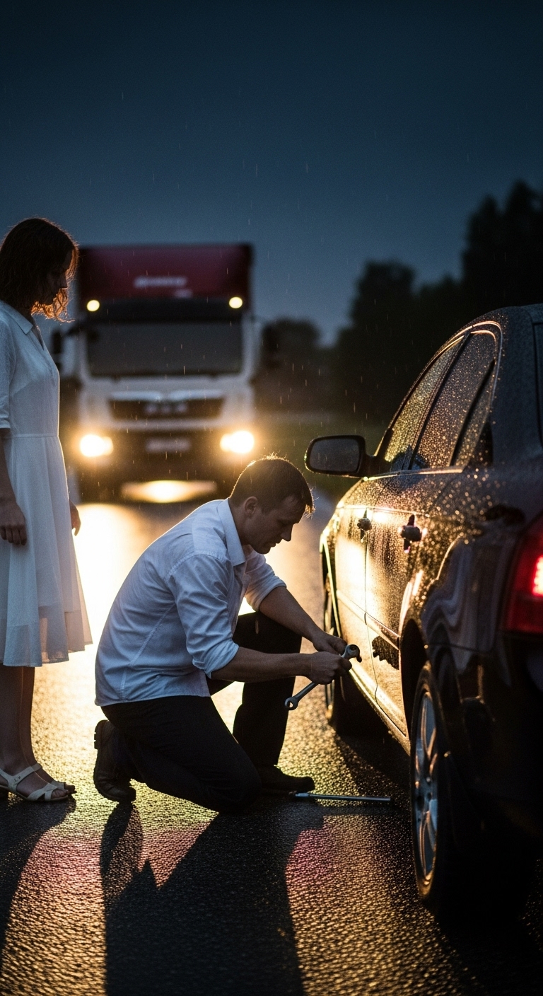 Ryan’s old truck came to a halt when he spotted a woman standing on the side of the highway. Her sleek black BMW, a car that looked like it cost more than his entire life’s worth, had a flat tire. The woman, drenched from the rain, was clearly out of her element. As Ryan’s foot hovered between the gas and brake, he heard his father’s voice in his head: “You help folks when they need it, son. Doesn’t matter who they are.”