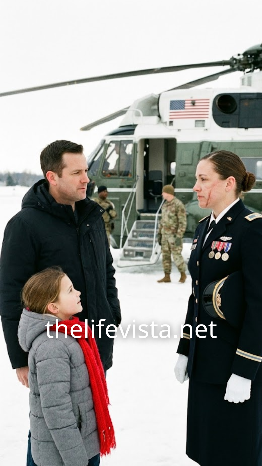 Emma peeked out from behind her father, fascinated by the helicopter and the imposing figure approaching them.
