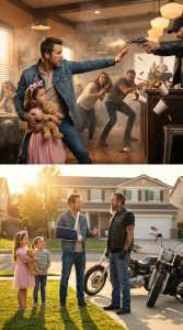 The man’s finger tightened on the trigger. Adam didn’t think—he moved. He lunged forward, throwing himself between the gunman and the little girl just as the revolver barked. The bullet tore through his shoulder, spinning him around. Pain exploded, but Adam stayed on his feet, arms spread wide, shielding the child. “Daddy!” Sophie screamed, her voice slicing through the ringing in his ears. Thunder moved like lightning, tackling the gunman before he could fire again. The revolver skittered across the floor. In seconds, the other bikers had the shooter pinned, his arm twisted, whimpering.
