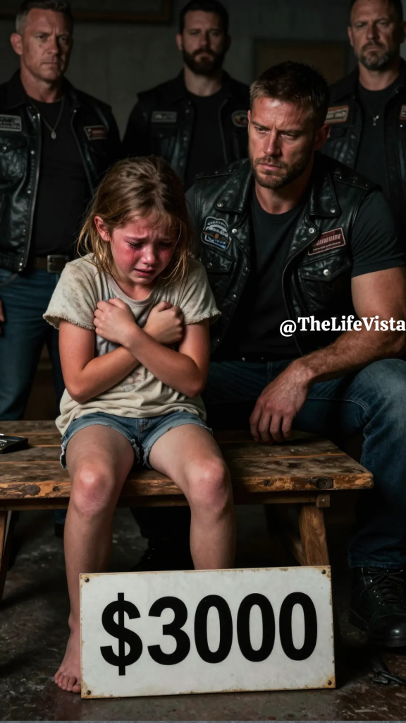 6-year-old Emma crashed through the doors of Thunder Road Motorcycle Club, her bare feet leaving bloody prints on concrete, screaming words that made 60 battleh hardened bikers freeze mid-con conversation. My stepfather’s selling me right now for $3,000. The man’s coming to get me, please. Before anyone could react, two vehicles pulled into the gravel lot, a rusted pickup and a black sedan.