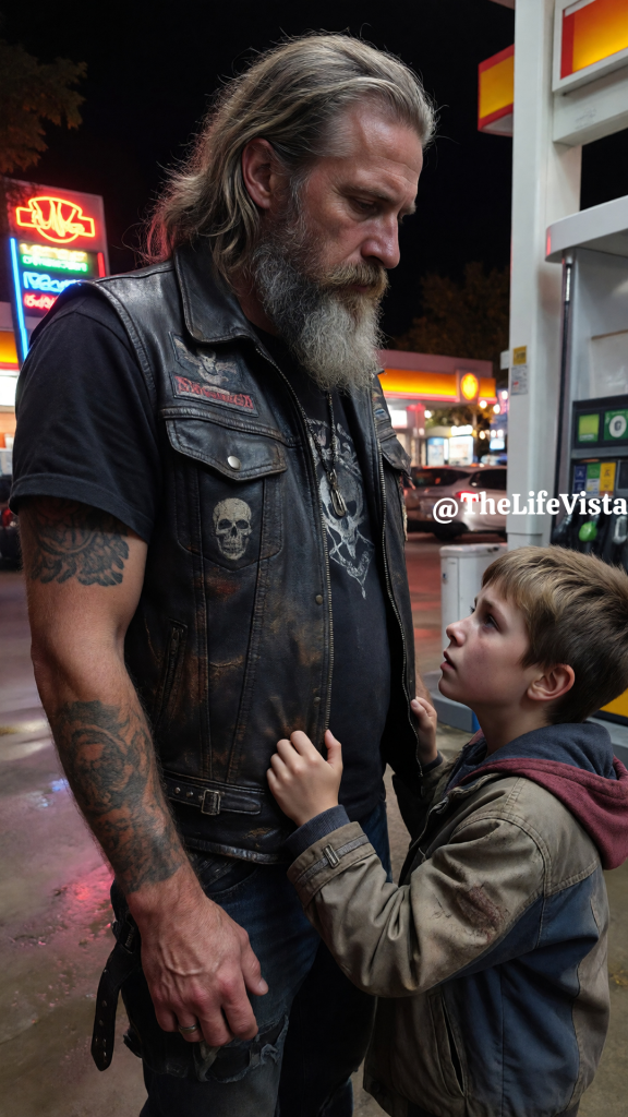 I was standing at a gas pump late at night when tiny fingers pulled at my colors from behind. I turned, already annoyed and ready to bark at whoever thought it was a good idea to grab a biker’s vest, but the words died in my throat the moment I saw him.