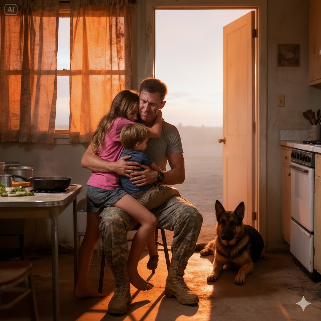 The war had taken him far from home, but the true victory was right here: two children who still believed in him, a loyal dog who never wavered, and the strength to start over.