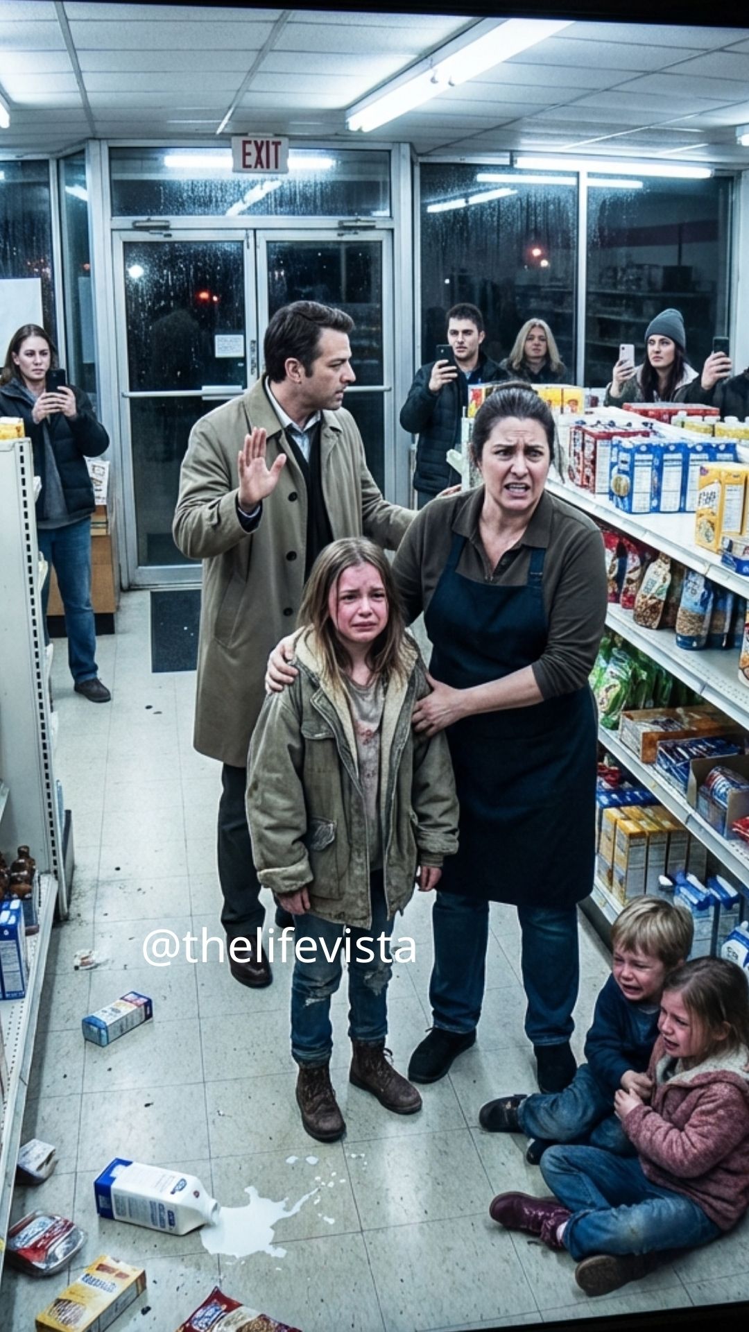 The store manager, a tall man with a stiff jaw and a badge that read Brian Keller, grabbed her arm before she could push the door open. The box of milk fell out and hit the floor with a soft thud.