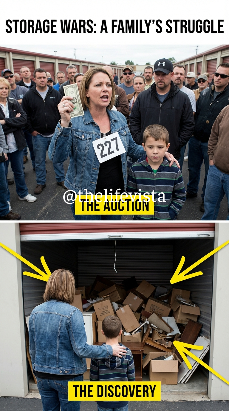 Unit 14 sat off to the side, door dented, label half-peeled, dust coating the frame. One man joked that even spiders moved out years ago. Another snorted that the unit was only good for dumping trash. The crowd laughed in that loose, careless way people do when they assume everyone around them is comfortable. Maya studied the empty corners, imagining a cold floor where she and her son could hide for one night. Her palms grew sweaty. Her breath felt thin. She knew how ridiculous it looked, but desperation pushed her forward. Jalen whispered that they could keep walking. She nodded, but did not move. When the auctioneer reached unit 14, barely anyone raised their head. He called out the starting bid, voice echoing across the concrete. Silence followed.