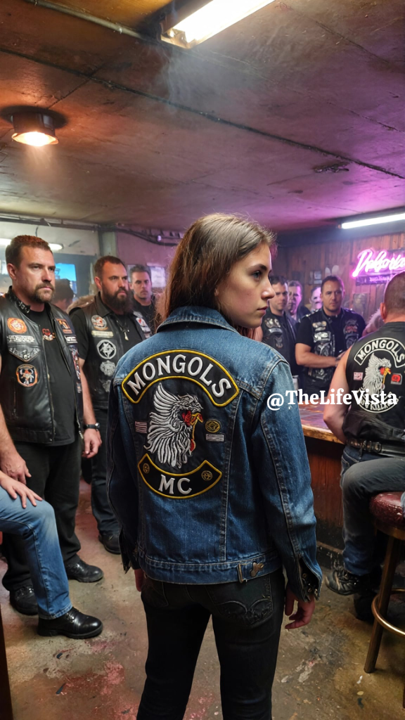 Behind her, the door swung shut with a final, sounding thud. The club president rose slowly, towering over her small frame, his weathered face unreadable as he assessed the rival colors she wore so boldly. Why would she risk certain death by walking into this lion’s den alone?