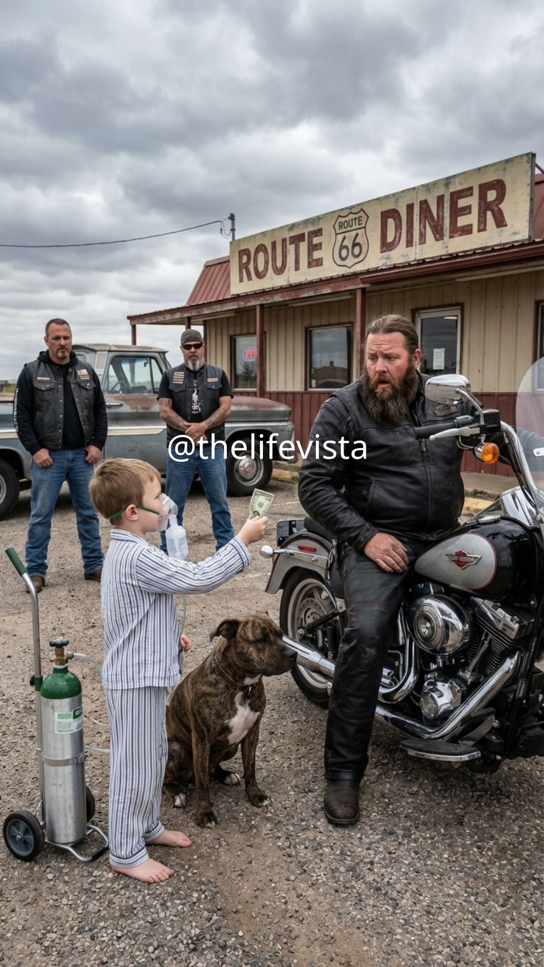 The kid looked like he weighed maybe sixty pounds. His skin had that gray, paper-thin color you see in hospital rooms, and his head was bald except for faint stubble that made him look even younger than he probably was. Beneath a loose hospital gown he was wearing bright blue dinosaur pajamas that flapped in the wind, and a clear oxygen tube trailed from his mask and disappeared into a small tank strapped to his back with the sort of homemade determination that told me this whole trip had been powered more by will than by sense.
