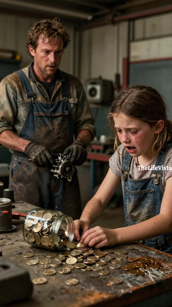 The jar struck my counter with a dull, uneven thud that echoed louder than expected in a garage already filled with the metallic hum of tools and the faint scent of oil. Coins spilled everywhere, rolling across the scratched surface in a chaotic scatter of copper and silver that gathered in uneven piles against the edge. I paused in the middle of rebuilding a carburetor, watching the small avalanche settle while the girl stood silently in front of me. She looked no older than ten, her hair tied loosely back but already falling apart, her face marked with dirt and tear tracks that told a story before she even spoke. Her hands trembled slightly, and the grease on her fingers suggested she had come from somewhere like this, somewhere she had searched for answers on her own.