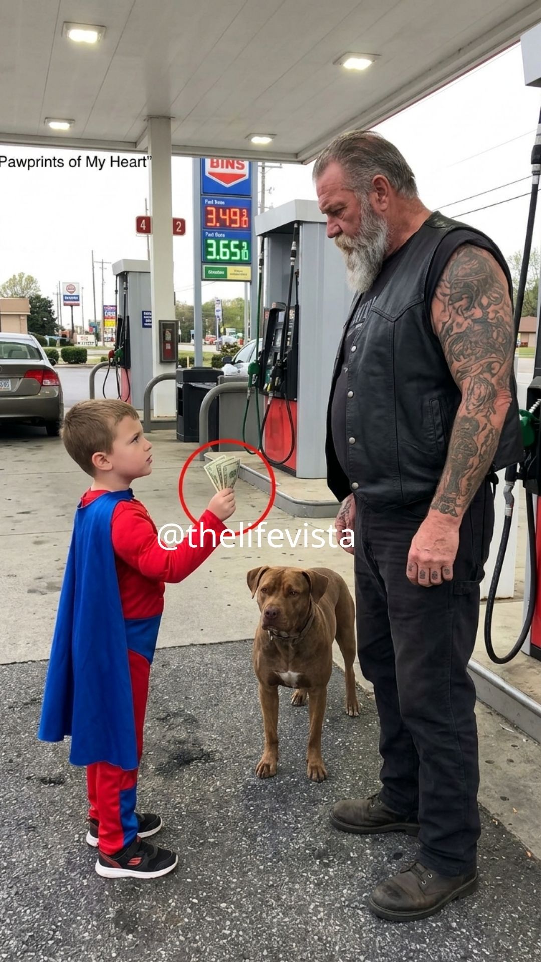 A dying 10-year-old boy handed me a crumpled $20 bill, begging my biker gang to adopt his scarred rescue pitbull and crash his funeral before his bullies ruined it, and I remember thinking that in all my decades of riding across this country I had never been hired for something so sacred or so heartbreakingly small. The kid practically fell out of the driver’s seat of the crookedly parked sedan, but before any of us could rush over, a massive, scarred pitbull leaped out and stood protectively over him, paws planted wide in the gravel like a seasoned bodyguard who had already seen too much of the world. The dog let out a low rumble, locking eyes with twelve heavily tattooed, leather-clad bikers as if weighing whether we were threat or family.