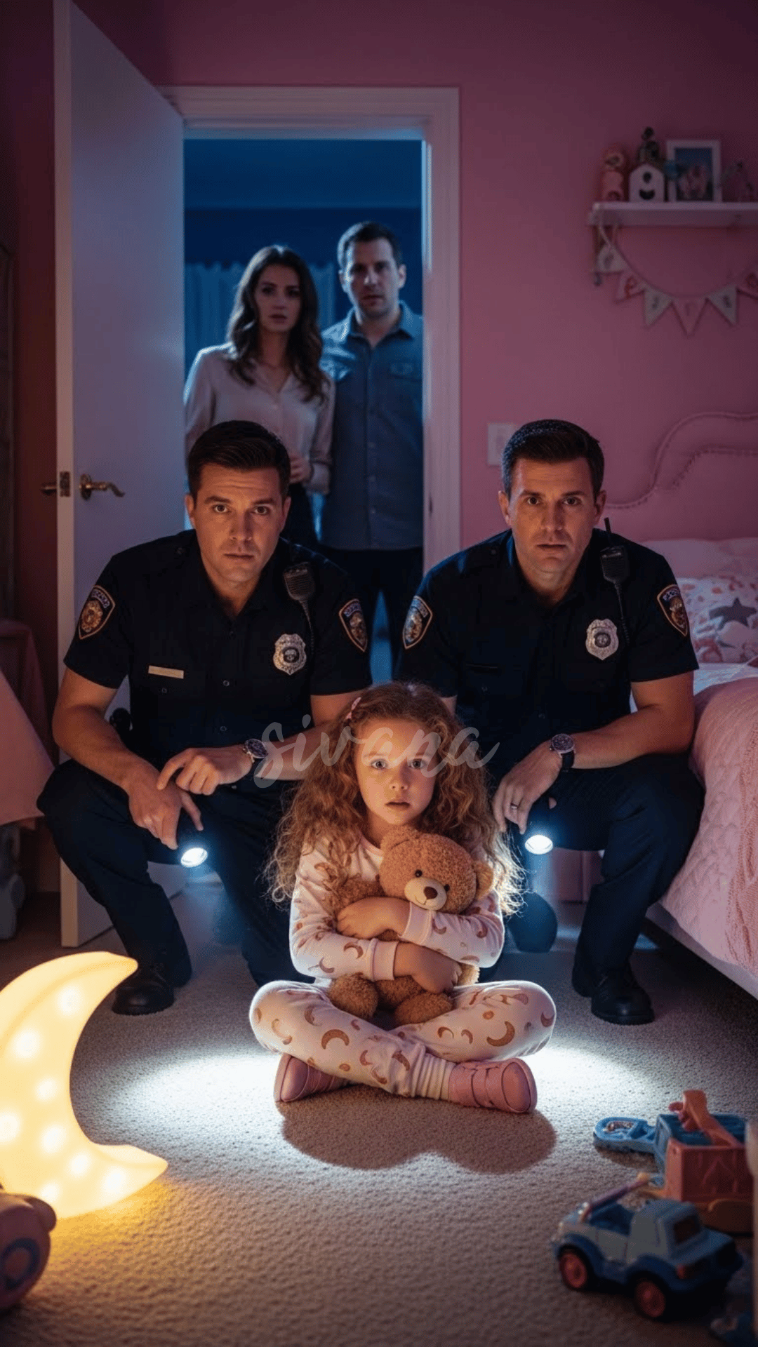 Mia sat on her bedroom rug in pajamas with tiny moons, clutching a stuffed bear like a life raft. She didn’t run to the officers. She simply pointed—to the small bed with the pink quilt folded perfectly at the corner.