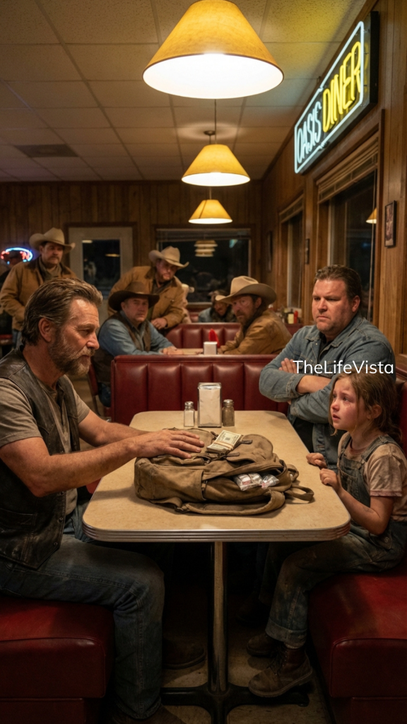 A little girl stepped inside, small enough that the door seemed too heavy for her, yet she pushed it open with quiet determination. She could not have been older than seven, her clothes oversized and coated with dust as if she had traveled farther than she should have. A heavy backpack dragged against her shoulders, its weight pulling her slightly forward with each step she took. Her eyes moved quickly around the room, searching faces as if measuring safety in strangers. Without hesitation, she walked directly toward Rowan’s table, stopping close enough that he could see the tremble in her hands. Her voice, when she spoke, was barely above a whisper, yet it carried through the diner like a question no one wanted to hear.