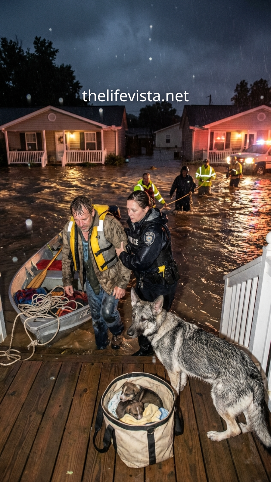 Hope barked once—sharp and urgent—toward a row of nearly submerged houses.