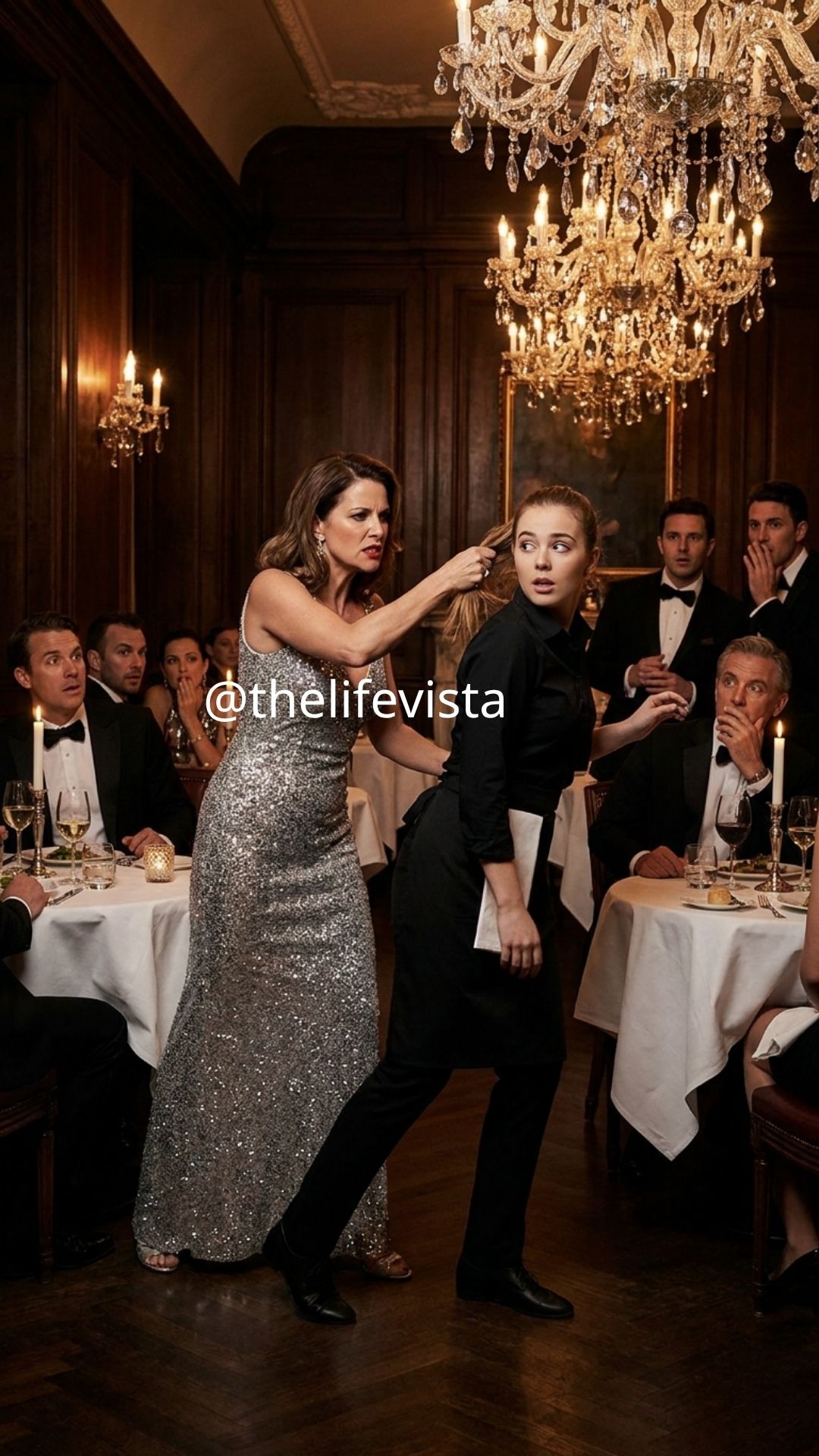 The young waitress cried out in pain and shock, nearly losing her balance. One hand flew to her scalp where the woman’s grip burned, while the other clutched desperately at her apron. Around them, guests in tailored tuxedos and designer gowns turned in their seats. Conversations died instantly. Several phones rose above wine glasses and half-eaten plates of foie gras.