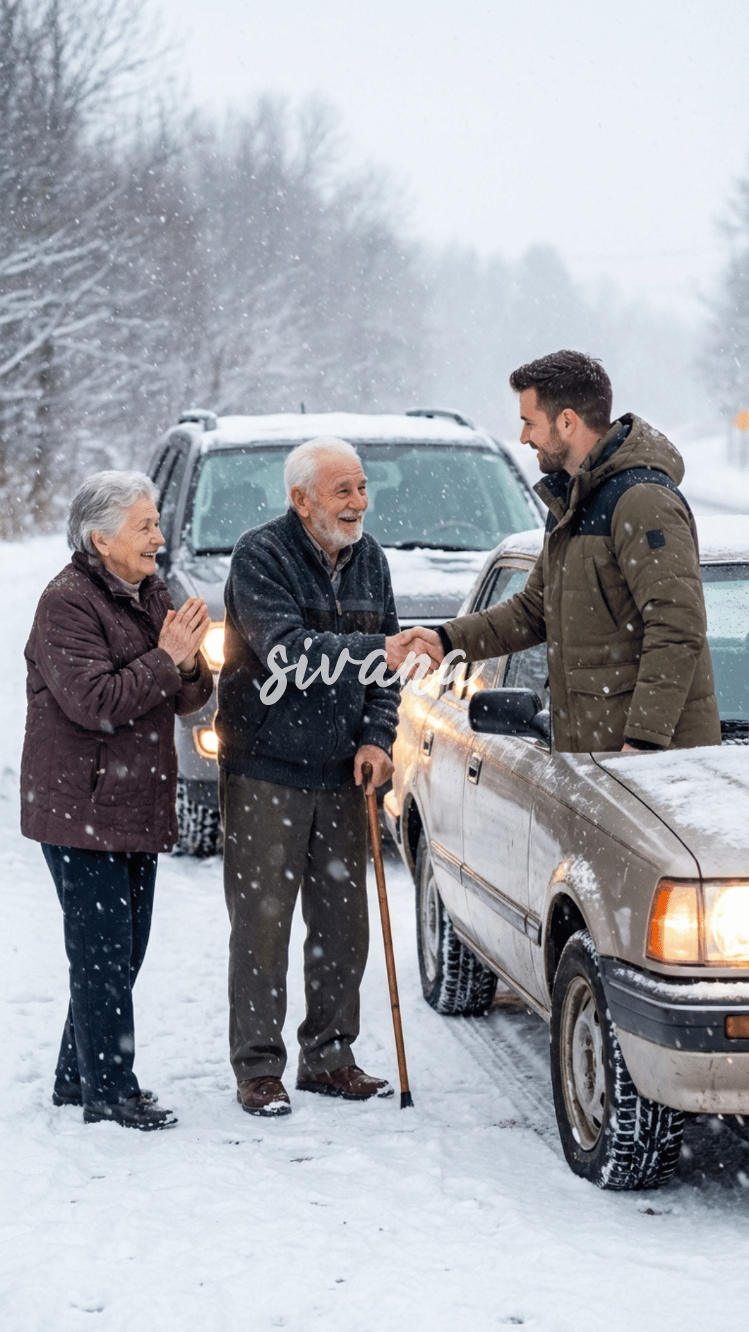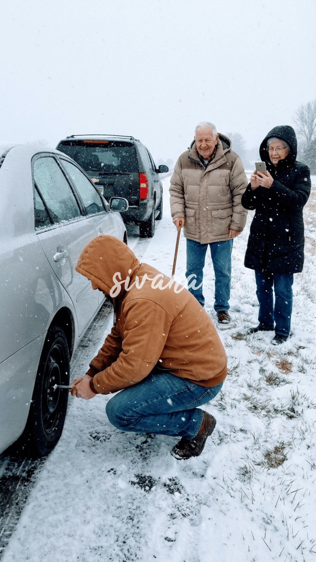 We were only forty minutes away from my parents’ place when I noticed a fading silver sedan pulled onto the shoulder up ahead. Two elderly figures stood outside the car, bundled in thin jackets that clearly weren’t built for the weather. The man was leaning heavily on the trunk, his hand shaking in the cold. The woman inspected the completely flat rear tire with a helpless expression.