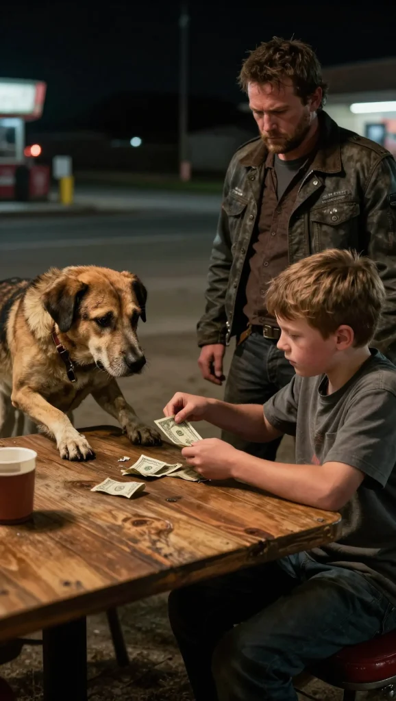The boy did not hesitate or look around for guidance, walking straight through the diner with a focus that unsettled those who began to notice him. He passed the counter, ignored the curious glance of the waitress, and made his way directly toward the table where the bikers sat. The room began to quiet without anyone quite understanding why, conversations fading as attention shifted toward the small figure approaching the largest presence in the diner. When he reached the table, he stopped, his hands trembling as he reached into his pocket. With a small, shaking motion, he dropped a handful of crumpled bills and coins onto the surface in front of them.
