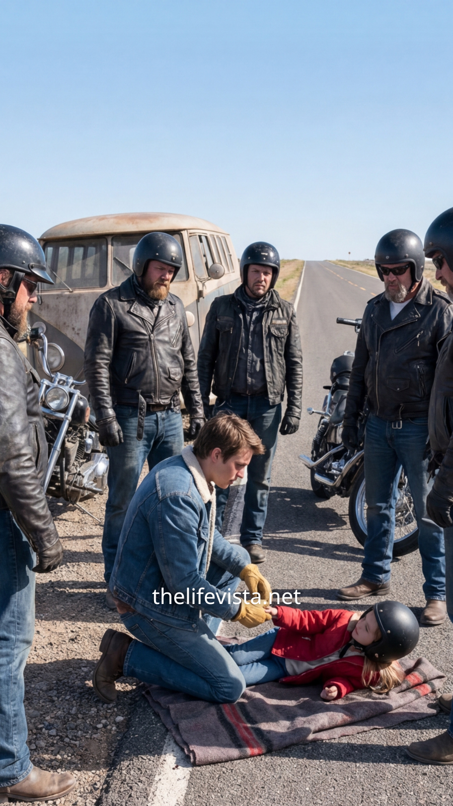 Engines shut off one by one, boots struck pavement, and voices rose around them as riders dismounted and gathered, confusion turning quickly into alarm. Someone was already calling for help, their voice clipped and urgent, while the driver of the van stumbled nearby, pale and disoriented, clutching his head as if trying to piece together what had just happened.
