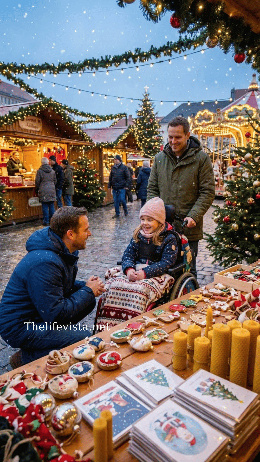 One crisp winter day, the market in Redbridge sparkled with twinkling lights and the smell of cinnamon. Snow gently blanketed the cobblestones, and vendors called out their goods beneath bright awnings. Among the shoppers, a little girl sat quietly in her wheelchair, observing the lively scene. Her name was Emma, and she was 7 years old. Her blonde hair glimmered in the light, her eyes full of wonder, and a pink knitted hat sat snugly atop her head. Her winter coat matched her hat, and although her legs couldn’t carry her, her spirit was more resilient than most children twice her age. She sat beside a bench near the fountain, hands folded in her lap, watching families walk by with shopping bags and laughter.