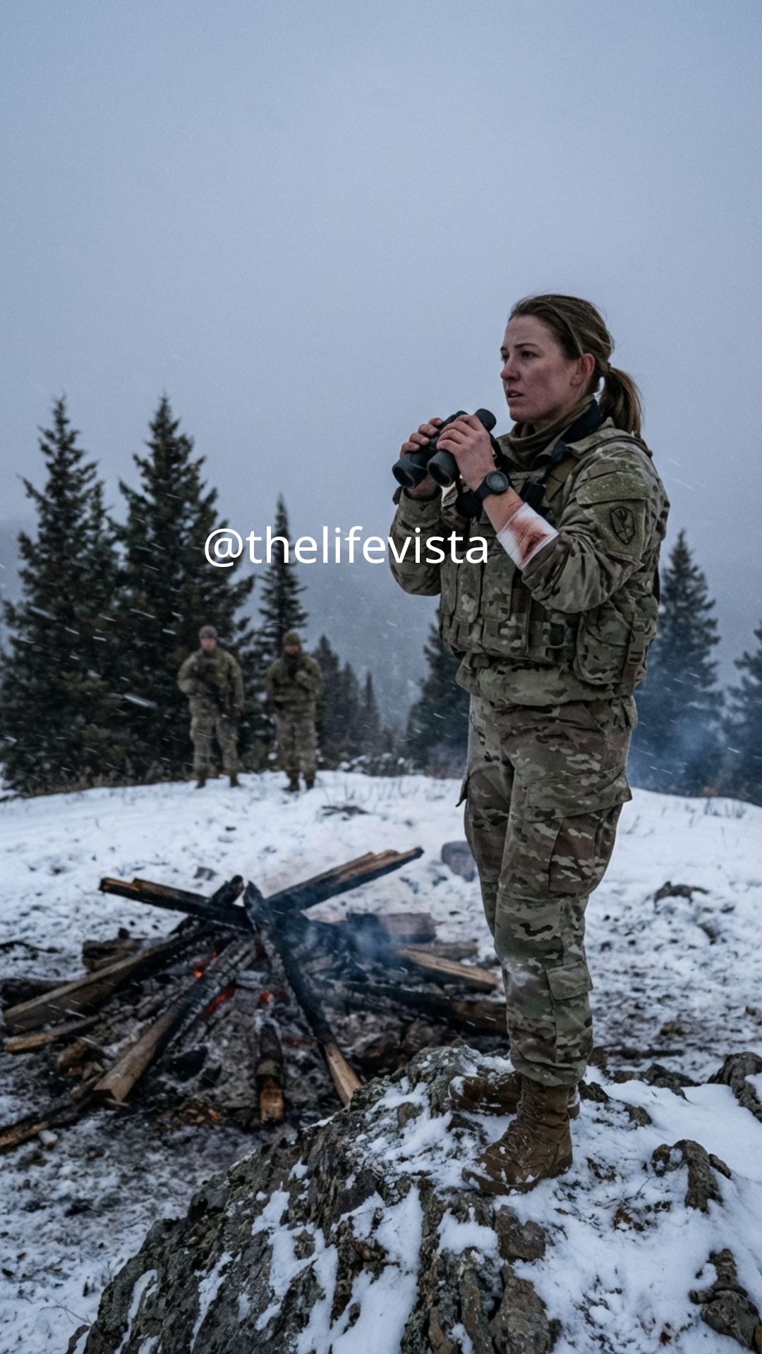 Her survival depended on time and temperature. The exposure would kill her in 40 hours, but she had enough ammunition to last far longer. From her position, she trained her rifle scope on the dying glow of the fire below, preparing for what came next.